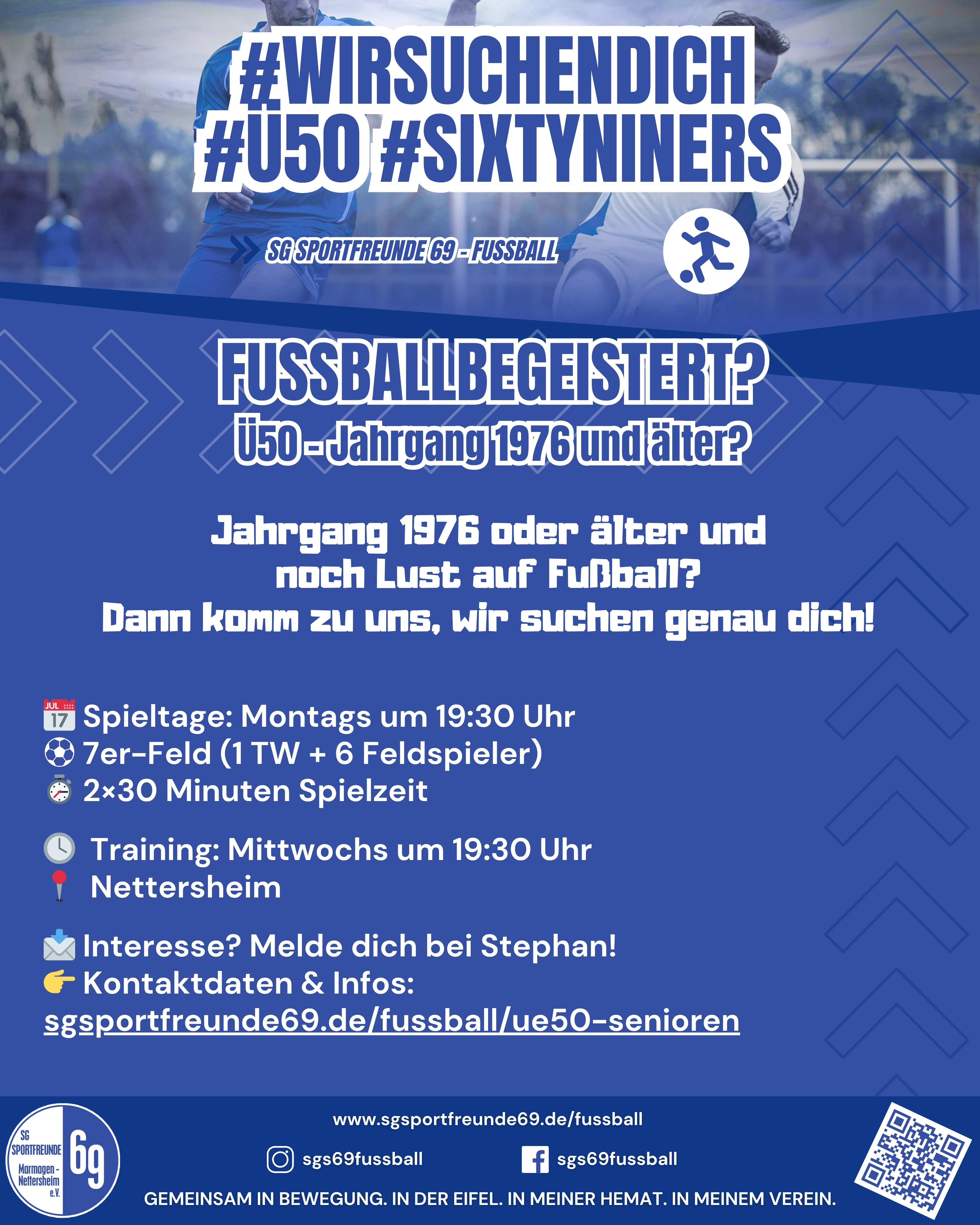 Auch in der kommenden Saison 2025/26 stellt die SG Sportfreunde 69 Marmagen-Nettersheim wieder eine Ü50-Mannschaft – und wir freuen uns über neue Mitspieler, die Lust auf regelmäßiges, aber entspanntes Kicken haben!